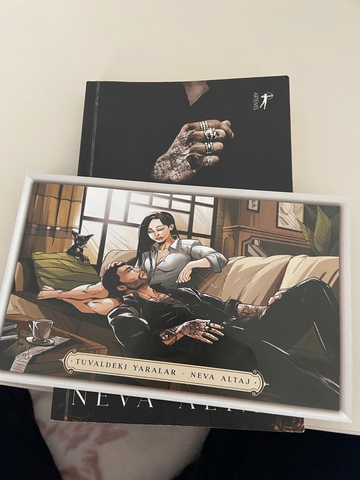 Neva Altaj'ın "Tuvaldeki Yaralar" romanı, derin duygusal temaları işler. Kapakta iki karakterin samimi bir ortamda detaylı çizimi yer alır.