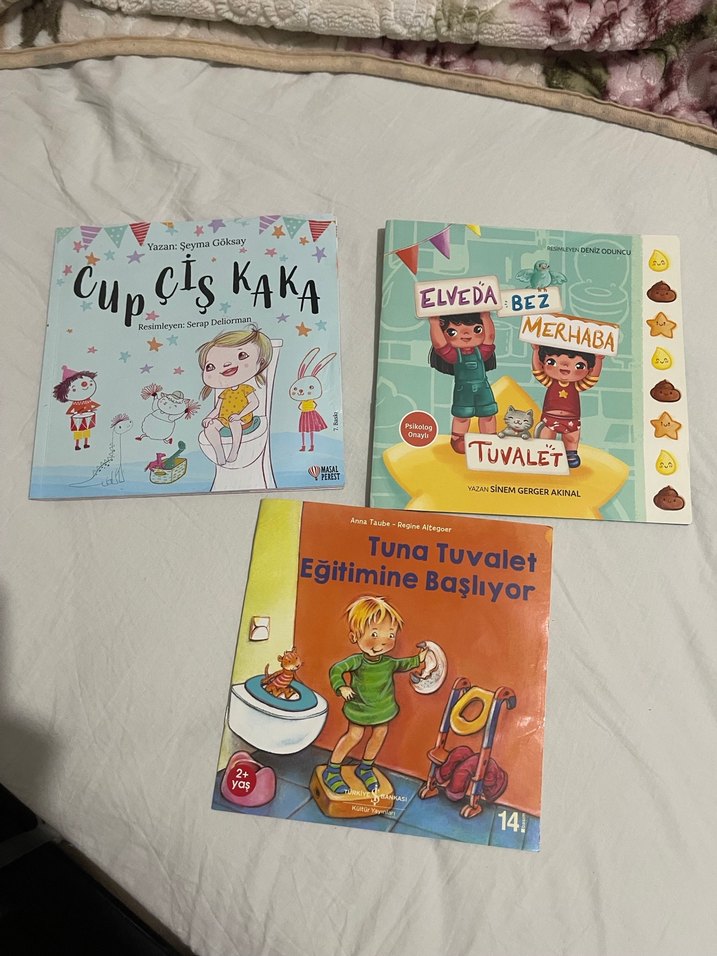 Tuvalet eğitimi ve hijyen konulu, renkli çizimler ve kolay anlaşılır dil içeren 3 çocuk kitabı. kitapları çok işimize yaramıştı. Fotoğrafta görüldüğü gibidir. Stickerları kullandık.