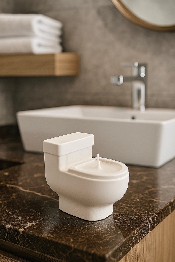 Pürüzsüz ve sağlam malzemeden yapılmış, tuvalet şeklinde beyaz mumluk. Banyo için benzersiz dekoratif ürün. ️
