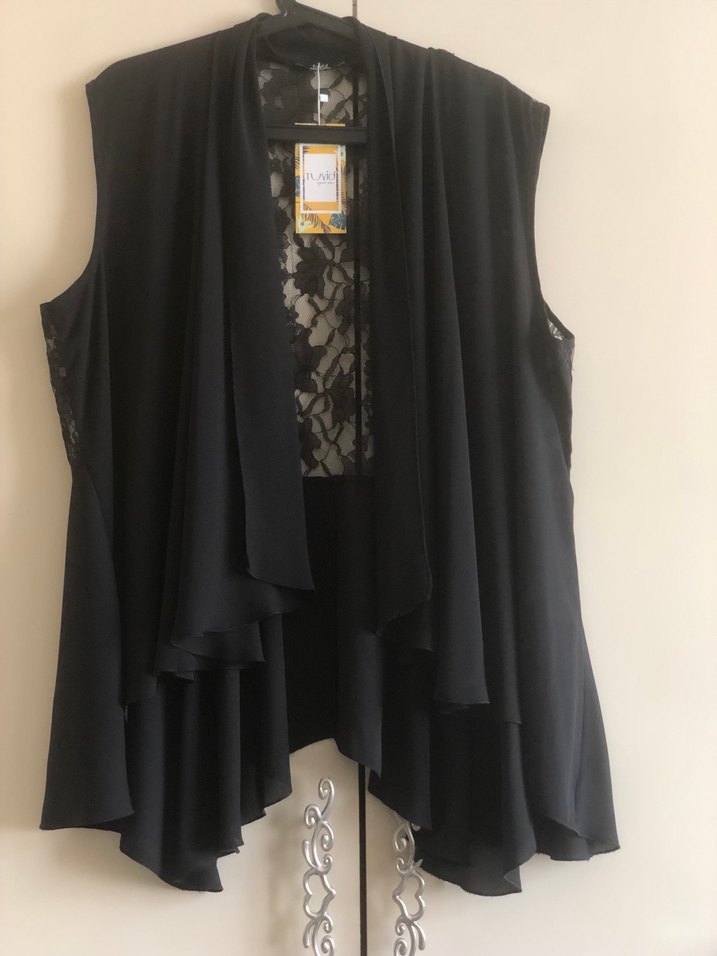 60*70*80 CM.Siyah, kolsuz, ipeksi kumaştan drapeli ve salaş kesim midi yelek. Straplez yakalı, ofis için uygun gotik tarzda klasik şıklık sunar.