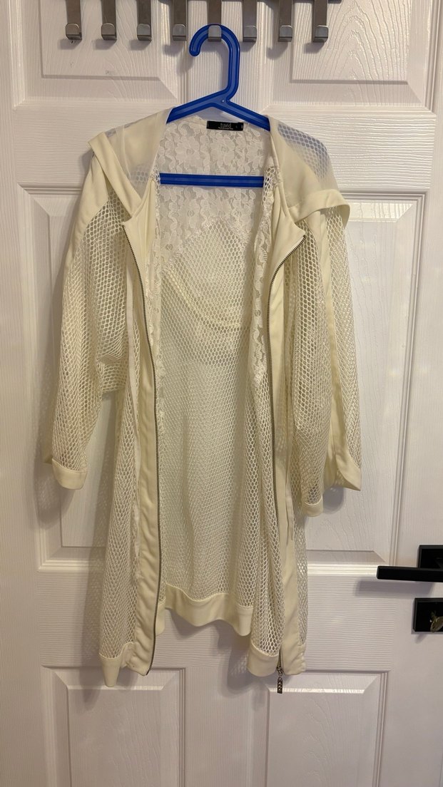 Beyaz midi boy hamile ceketi, uzun kollu, dantel detaylı ve notched lapel yakalıdır. Sentetik kumaştan, bol kesim ve günlük sokak stili için uygundur.