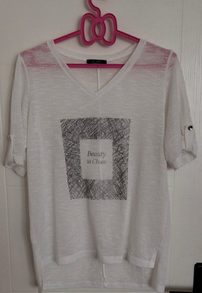 Tiril tiril v yaka çok hoş bir T-shirt. "Beauty in Chaos" yazılı.