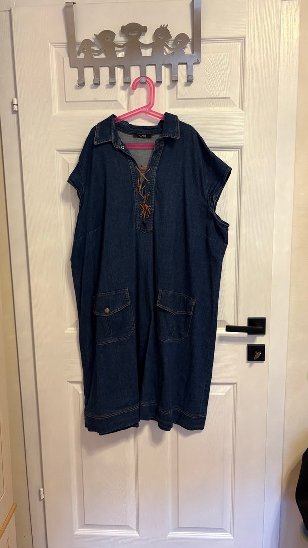 Kolsuz lacivert kot midi elbise, yakalı ve bol kesimdir. Ön cepleri ve kemerli beliyle bohem tarzını yansıtır.