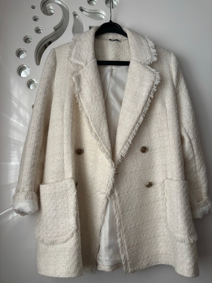 Beyaz tüvit ceket 1 kez kullanıldı hiçbir sorunu yok kalçayı örtüyor