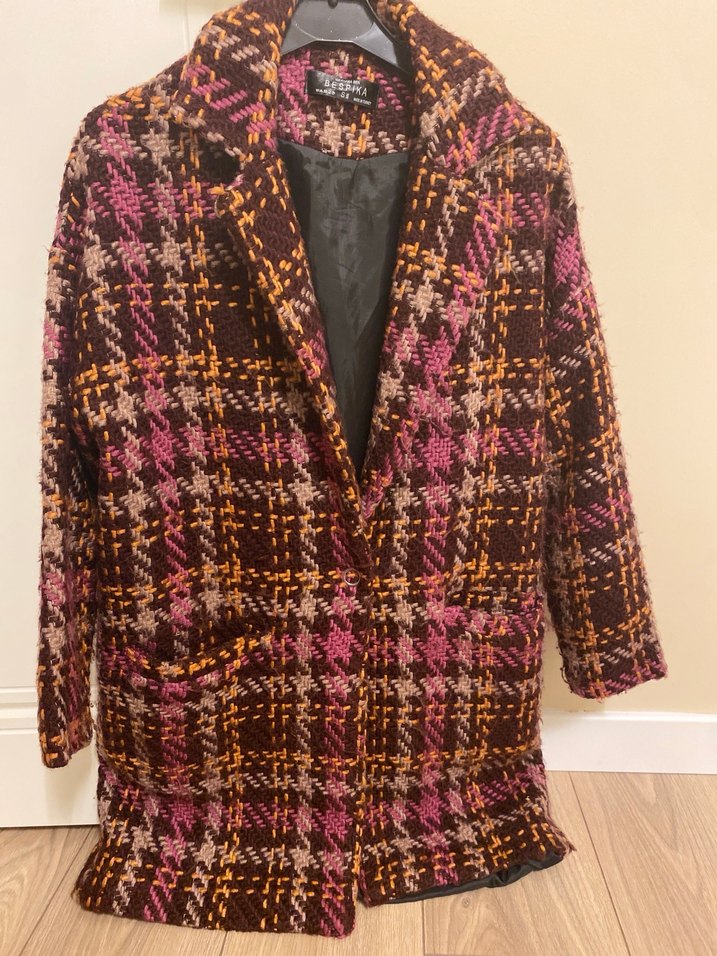 Pembe yün kaban, düğmeli ve uzun kollu, normal kesim ve midi boyda. Koyu renkli tie-dye desenli, rahat sokak stili için uygundur.
