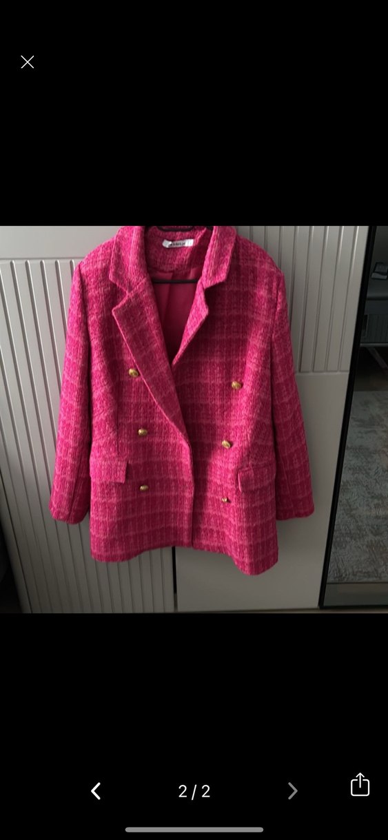 Parlak pembe, kareli desenli, düğmeli, kısa kesim ve regular fit kadın blazer ceket. Uzun kollu, notched lapel yaka, günlük sokak tarzına uygun.