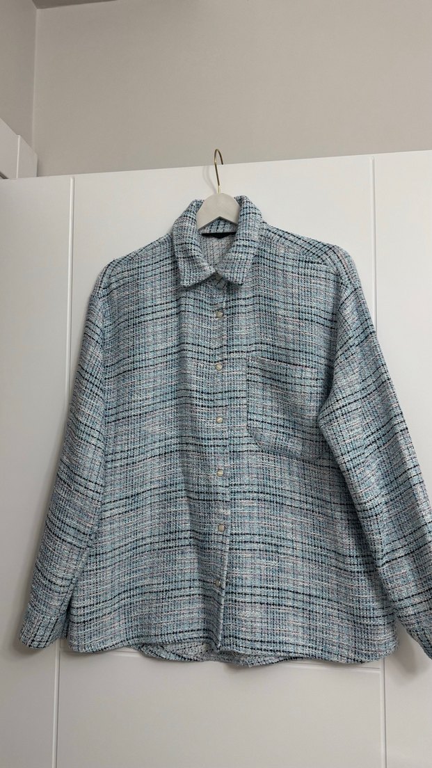 Mavi renkte, tüvit kumaştan yapılmış, düğmeli ve yakalı, uzun kollu bol kesim gömlek. Günlük sokak stili için uygundur.