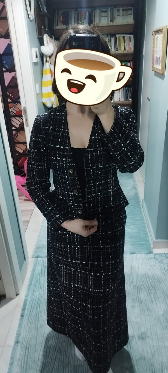 Düğmeli, siyah ekose desenli kadın takımı, normal uzunlukta ve regular fit. Uzun kollu, yaka kısmı notched lapel, ofis için uygun şık bir seçenek. S beden.