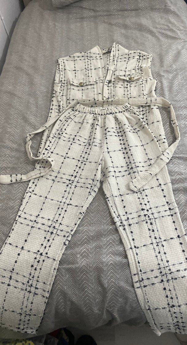 Nakışlı ekru kare desenli beyaz kumaş V yaka ve askılı kollu, kemerli ve uzun boylu, rahat kesimle günlük kullanıma uygun.
