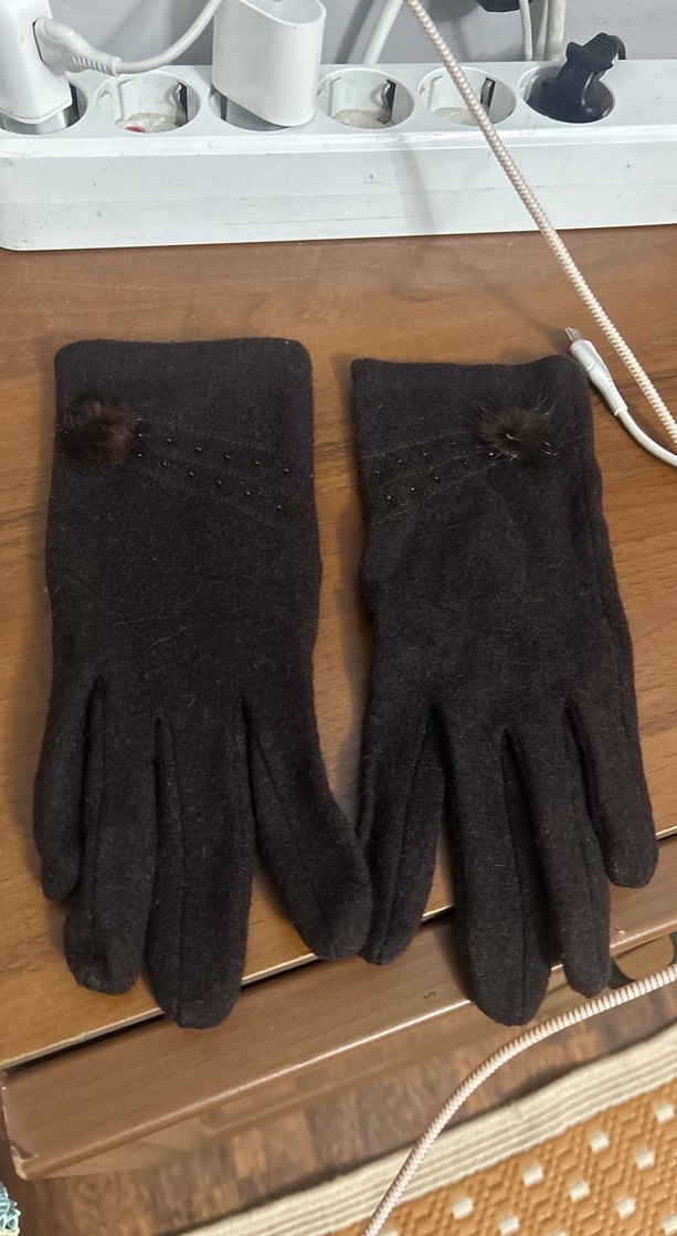 Tüy, boncuk detaylara sahip, yumuşak ve sıcak kumaştan yapılmış koyu kahverengi kadın eldiveni. Rahat ve vintage gotik tarzda.