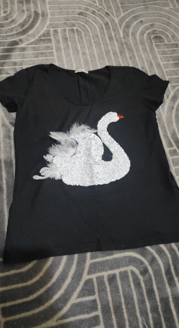 Dar kesim, yuvarlak yaka ve kısa kollu bu tişört tüylü kuğu baskısıyla dikkat çekiyor. Günlük kullanıma uygundur.