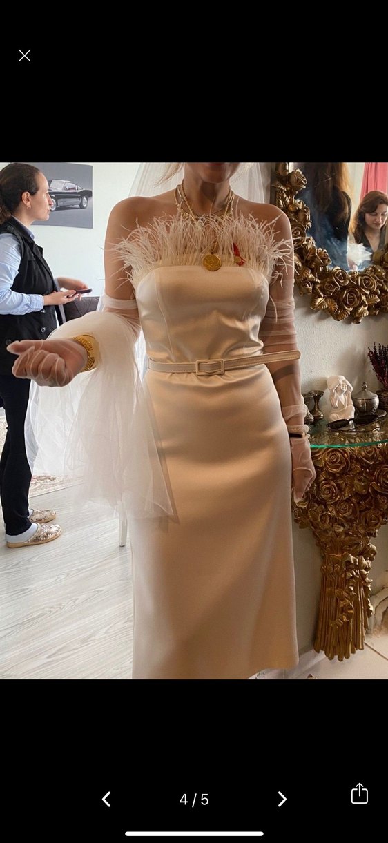 Tüy detaylı straplez beyaz abiye , avangart tarzı bir araya getiriyor. Vücuda oturan kesim. Midi boy . Ben evden çıkış elbisesi olarak bir kez 2 saat kadar giydim