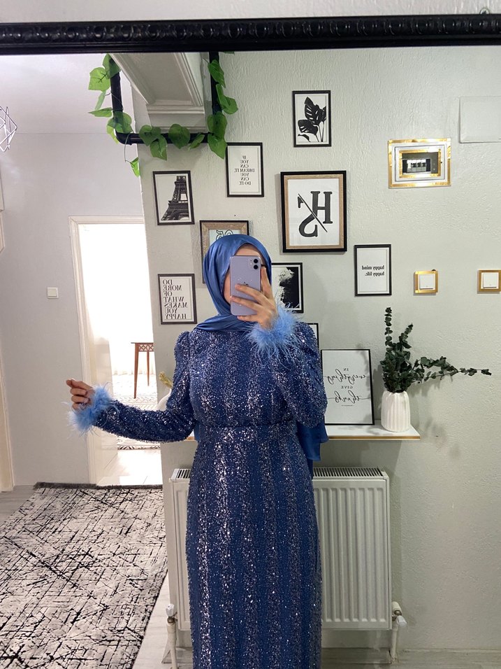 38-40 beden Şalı yoktur Temiz ürün son fiyattır Mavi uzun kollu abiye elbise, yüksek yakalıdır ve manşetlerde tüy detayları bulunur. Bağlama desenlidir ve düzenli kesime sahiptir, gösterişli partiler için uygundur.✨