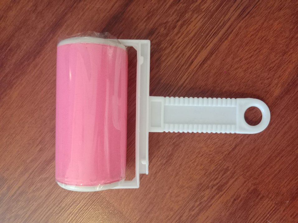 Kumaş üzerindeki tüy ve tozları temizlemek için beyaz saplı pembe renkli tüy temizleyici rulo. marka temsilidir