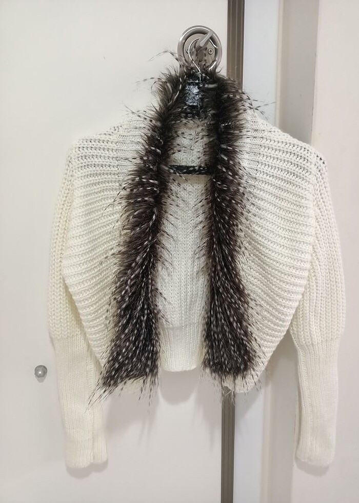 İki kol arası 48 cm, boy uzunluğu 44 cm. Crop değil ama kısa bir hırka. Yakasındaki tüy detayı çok havalı duruyor. Kalındır, sıcak tutar. Marka temsilidir. Butik ürünü.
