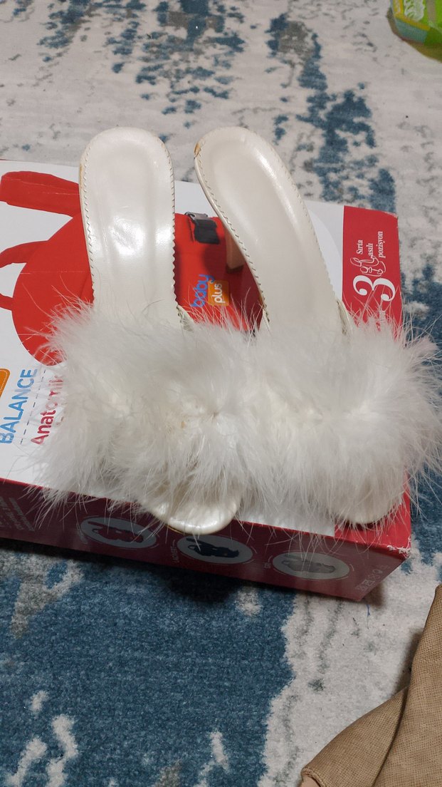 Tüylü Beyaz Stiletto Kadın Terlik ve gelin ayakkabisi