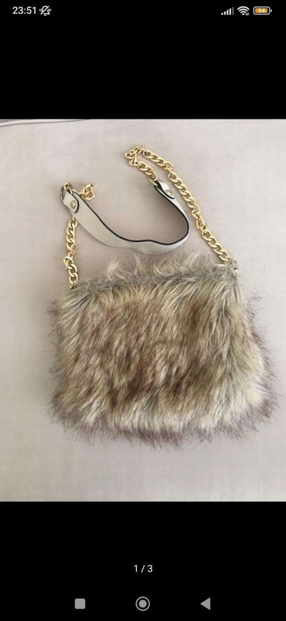 Kadın çantası, bej ve gri zebra desenli yumuşak sentetik kürk detaylıdır. Altın zincir askısı rahat omuz pediyle birleşir, sıcak ve karşı kültür tarzındadır.
