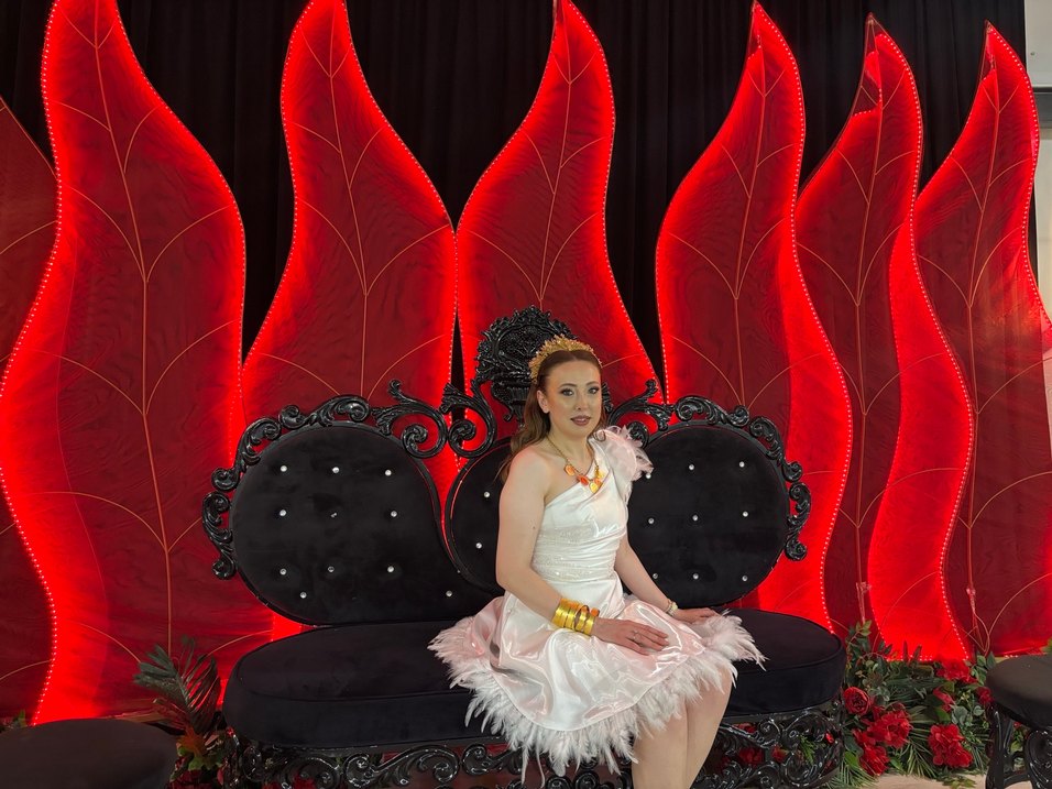 Saten kumaştan, tüylü detaylı ve etnik desenli, straplez ve askılı kollu, hafif canlı beyaz renkli uyumlu kesim after kostümü. ✨