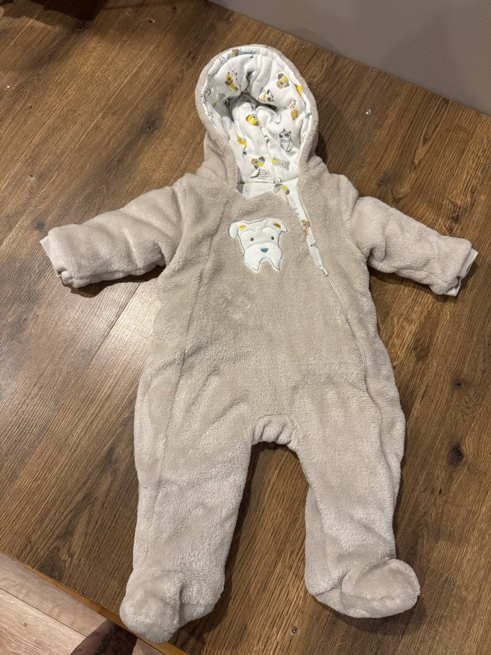 Gri renkte, yumuşak ve sıcak kumaştan, tüylü detaylı, kapüşonlu ve baskılı iç yüzeyli bebek tulumu. ❄️ Almanya’dan alındı.