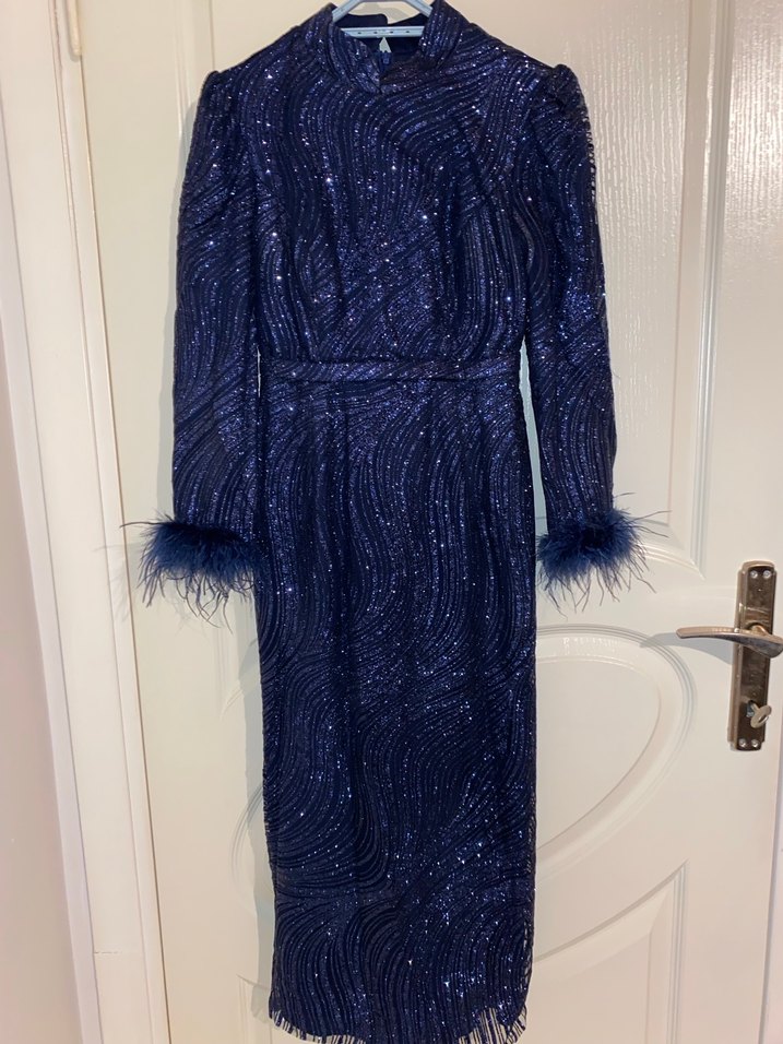Dar kesim, uzun boylu bu abiye elbise, yüksek yakalı ve tüylü manşet detaylı uzun kolludur. Koyu lacivert yılan desenli modern klasik tarzda, gösterişli partiler için uygundur.