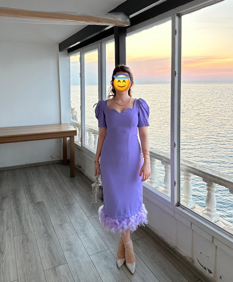 Özel dikim, 1-2 kez giydim. Pastel mor renkte, V yakalı ve kısa balon kollu, vücuda oturan midi elbise. Etek ucu tüy detaylı