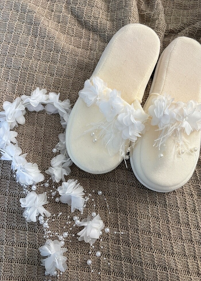 Tüylü incili lohusa terliği ve çiçekli taç