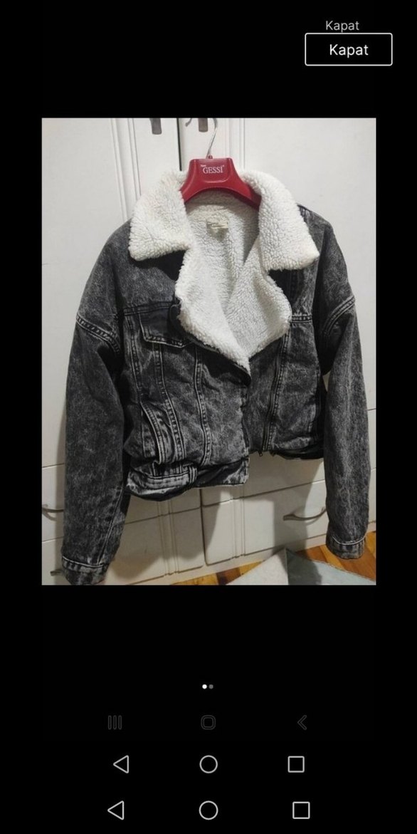 Gri renkli, tüylü yakalı ve bağlama desenli, bol kesim midi uzunluğunda kadın denim cekettir. Sokak stili için uygundur.
