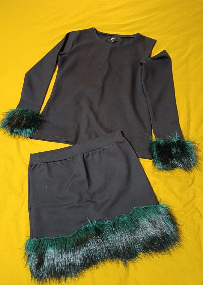 Mini etek, uzun kollu, kolları ve etek uçları tüylü etek bluz takım.