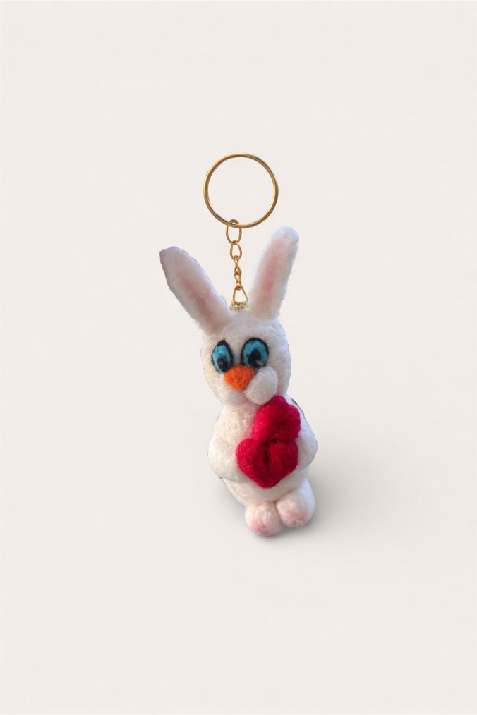 Renkli gözlere ve kırmızı kalbe sahip beyaz tüylü tavşan anahtarlık, püskül ve altın halka ile bohem ve retro tarzlara uygun.