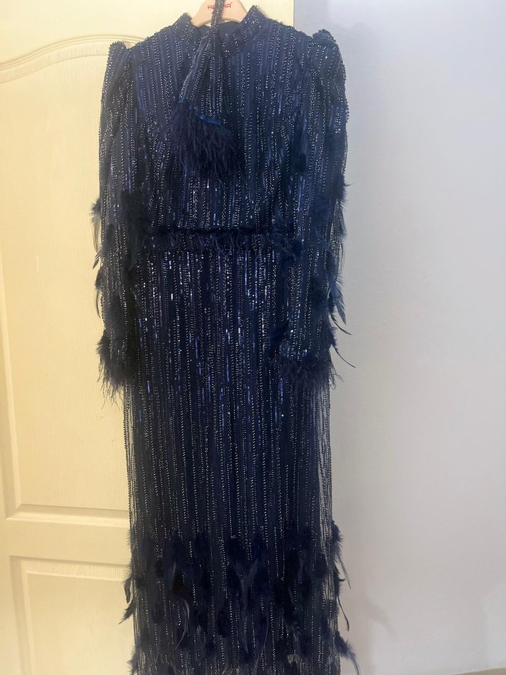 tüylü ve pul payetli lacivert uzun abiye elbise, yüksek yakalı, nakışlı desenlidir. düğünlerde için uygundur.✨ bir kez giyildi 42-44 beden uyumludur.