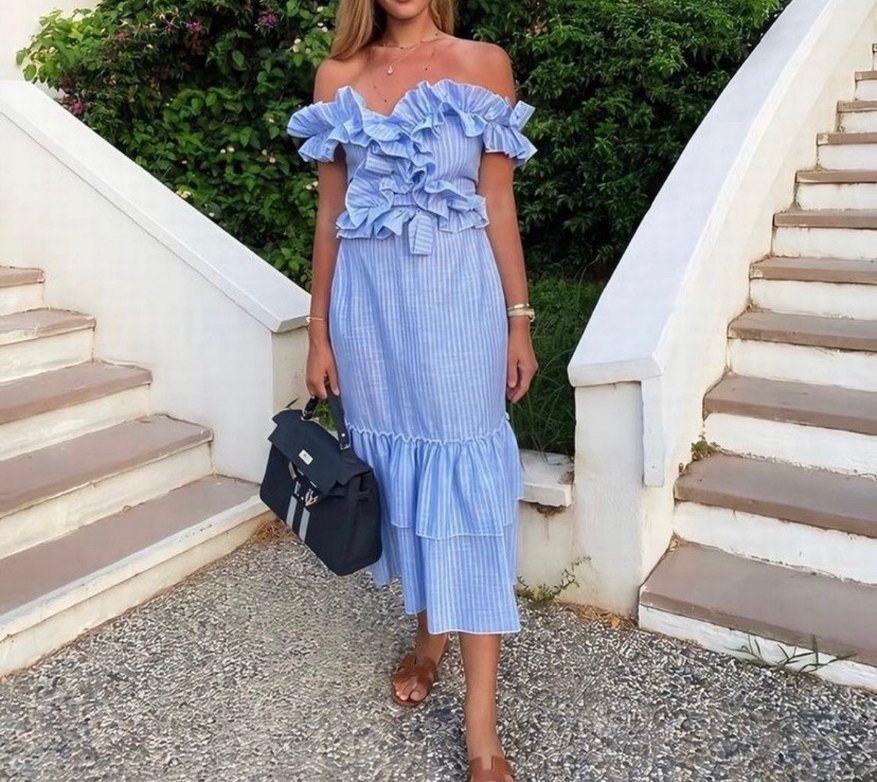 Pastel mavi renkte, uzun boy elbise; göğüs ile eteğinde volan detayları bulunur. Çizgili desende, rahat kesimli ve yumuşak sentetik kumaştan üretilmiştir. Tatilde bir kez giyildi kusursuzdur