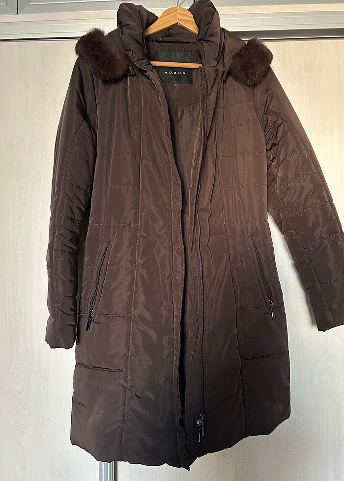 Kapüşonlu, kapüşon kenarı kürk detaylı, fermuarlı, kemerli, cepli mont. Boy uzunluğu omuzdan itibaren 82 cm. 40 beden ancak dar kesim