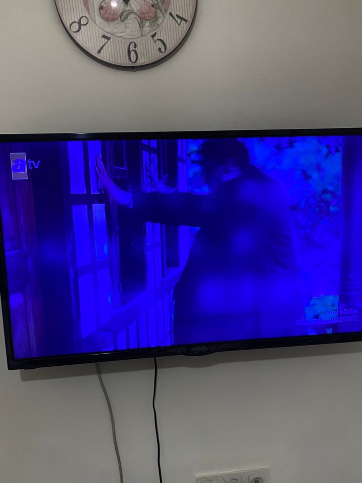 Ekranda sahne gösteren mavi renk duvara monte monitör, altında güç kabloları ve prizler görünür. Duvar montajı için uygun. ️