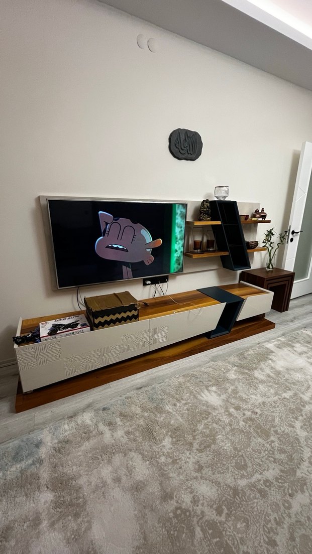 Duvara monte edilmiş, bej, ahşap, mavi renkli modern panel. Altında ahşap TV ünitesi bulunan şık bir oturma odası düzeninde yer alıyor. Ünitenin sağ alt kısmı biraz sallanıyor, kolaylıkla sağlamlaştırılabilir. Nills marka, ağaç, üzerinde hafif çizikler mevcut. Pazarlık payı vardır.