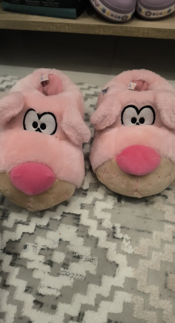 Ürün hiç kullanılmadı yalnızca etkinlik sırasında üzerine yapışkan bir madde düştüğü için defosu var Kızlar için pembe peluş ev terliği, yumuşak fleece malzeme ve tüylü detaylarla, eğlenceli çizgi film desenli, evde rahat kullanım için uygun.