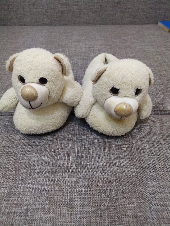 Beyaz peluş kumaştan yapılmış, nakış detaylı ve kürklü kız çocuk ev terliği, konfor ve sıcaklık sağlar. sadece tabanda deformasyon var