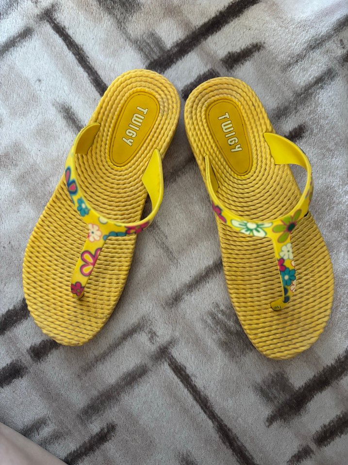 Twigy markalı, renkli tie-dye desenli sarı bohem tarzı kadın terlik, kama topukludur ve plaj kullanımı için uygundur. 2 kez plajda giydim kusuru yok