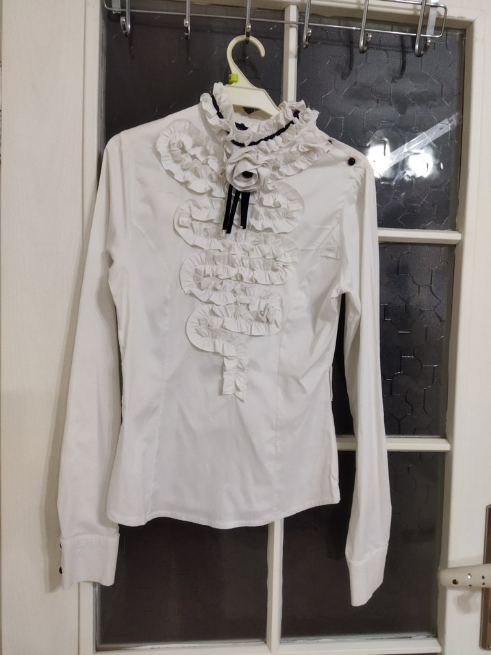 TWILIGHT marka 2 beden az kullanılmış 12_13 yaşa uyumlu uzun kollu yaka ve ön kısmı fır fırlı gömlek az kullanılmış hiç bir sorunu yok renk kırık beyaz koltuk altından koltuk altına genişlik ölçüsü 42 cm boy uzunluğu 61 cm kol boyu omuz dikişinden aşağı 64 cm ihtiyaç fazlası Düğmeli ve fırfırlı detaylara sahip, yakalı ve uzun kollu, beyaz gotik tarzda kadın gömleği. Yumuşak sentetik kumaştan, ofis için uygun şık bir parça.