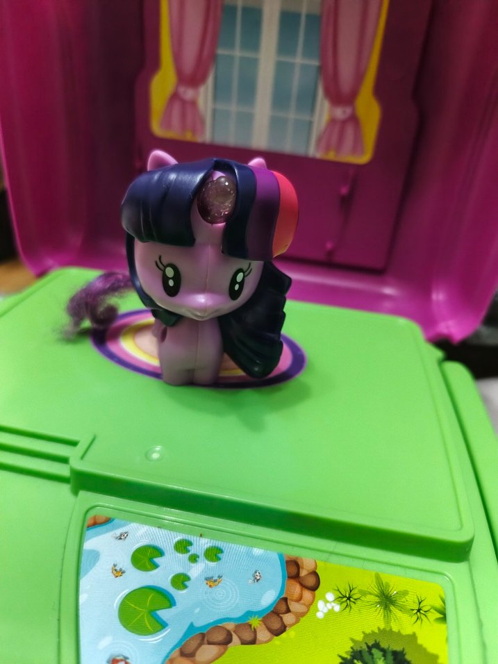 Koyu mor renkte, büyük gözlü ve parlak yeleli küçük figür oyuncak.