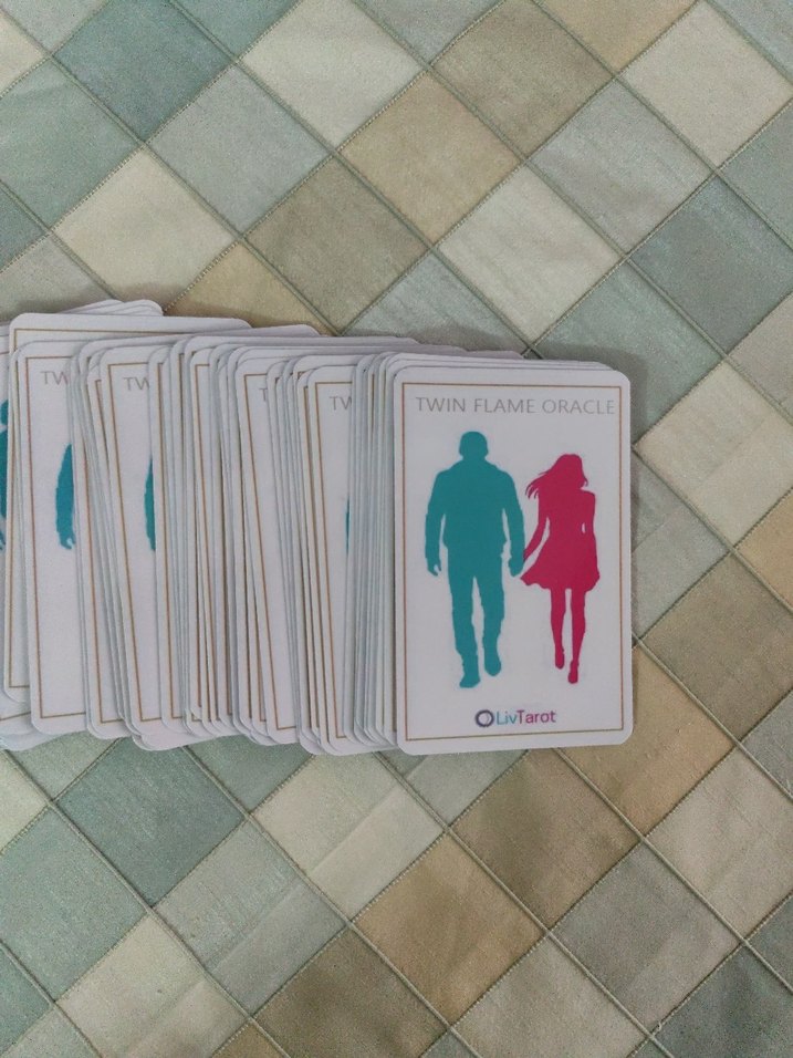 Bej renkte Twin Flame Oracle kartları, her kartta sembolik silüetler bulunur. Sezgisel rehberlik ve düşünce için uygundur. yeni