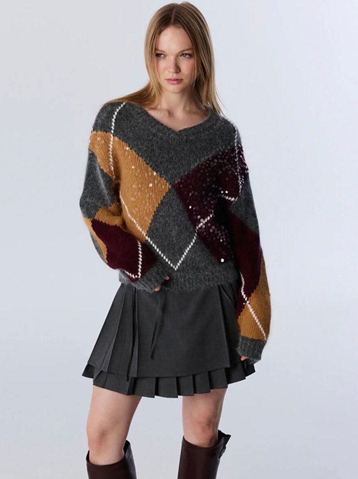 Yumuşak örme kumaştan, bol kesim V yakalı, renkli ekose desenli kısa uzunlukta kadın kazak. Uzun kollu, rahat sokak stili için ideal.