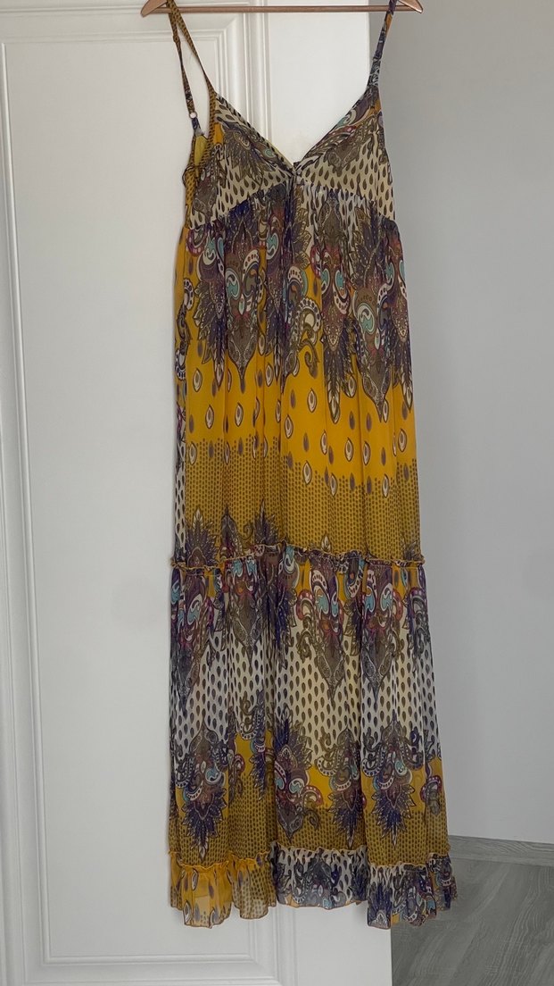 Bohem tarzda, çok renkli, uzun askılı elbise. Bol kesim, drapeli ve V yakalı, yumuşak sentetik kumaştan üretilmiştir.