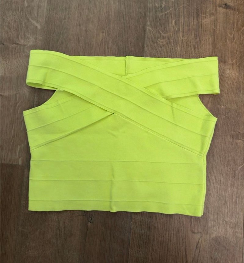 fosforlu sarı renkli, piliseli detaylı, askısız ve kısa kesim, vücuda oturan. Sokak modası ve dış mekan için uygun.