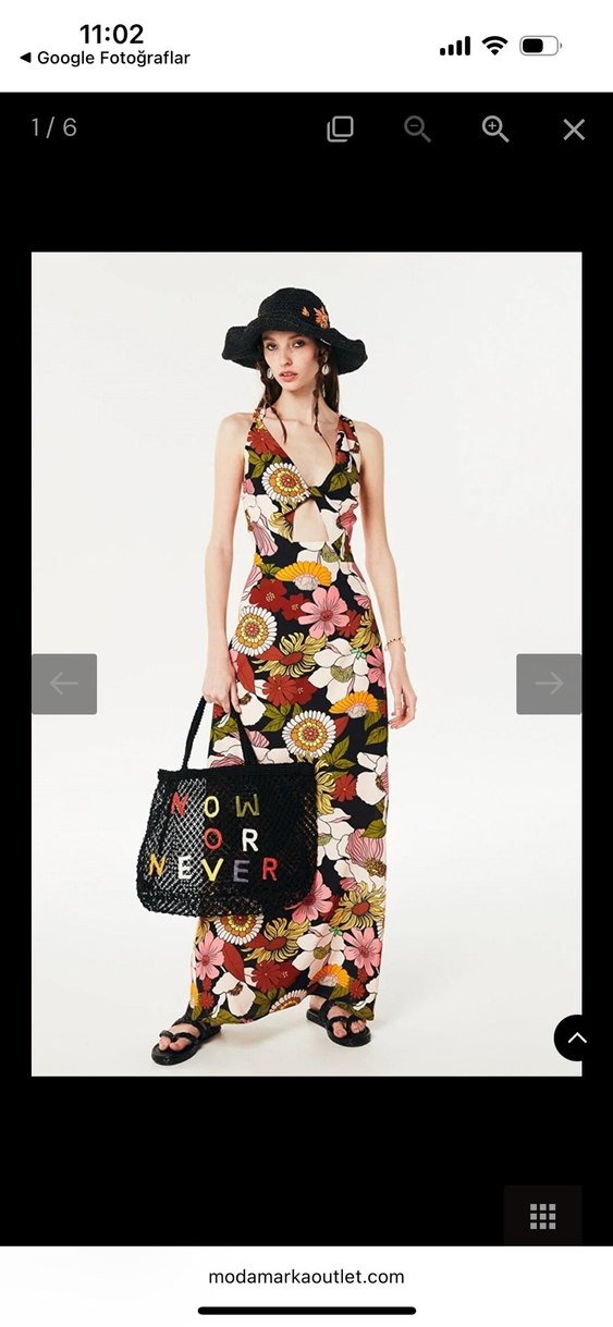 Çiçek desenli, dantelli, askısız ve kolsuz uzun elbise. Rahat kesimli, yumuşak sentetik kumaştan, bohem sokak stili için uygun.