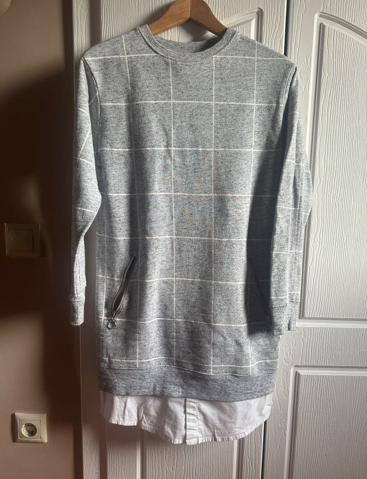 Twist Pamuk kumaştan yapılmış, cep fermuarlı, gri uzun kollu midi kadın sweatshirt. Salaş kesim ve bisiklet yaka detaylarıyla günlük sokak stiline uygun.