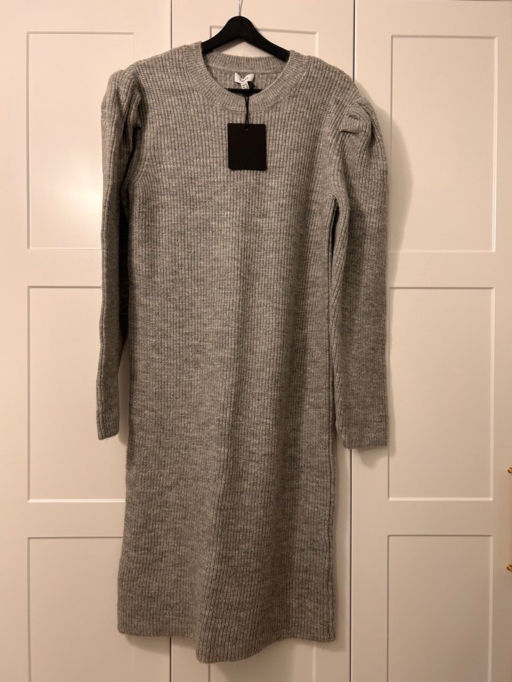 Gri renkli, uzun kollu, bisiklet yaka ve bol kesim triko midi elbise, yumuşak yün kumaştan rahat ve sıcak bir kullanım sunar.