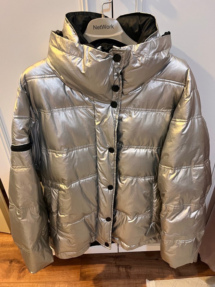 Düğmeli, yüksek yakalı, kısa kesim ve dar kesim gri kadın kışlık mont. Uzun kollu ve sokak stili tasarım twist markasına ait. ❄️