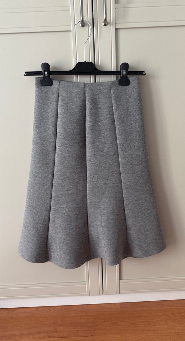 Gri renkte, pilili ve midi boyda etek. Rahat kalıbı ve yumuşak sentetik kumaşıyla günlük kullanıma uygundur.
