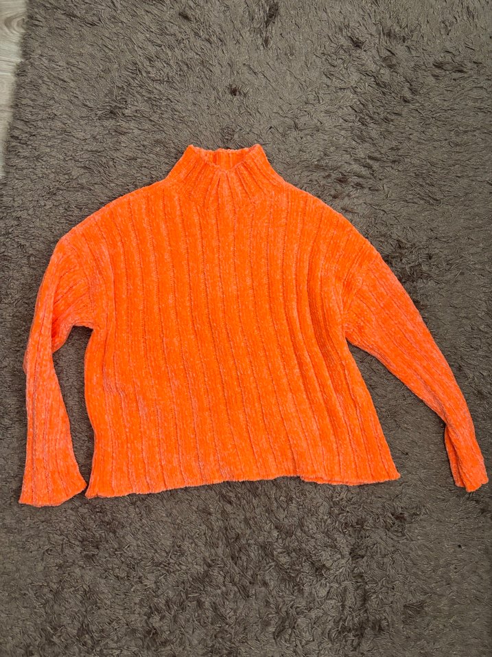 Turuncu renkli, balıkçı yaka ve uzun kollu, bol kesim örme kadın kazak, yumuşak ve sıcak kumaştan üretilmiştir.