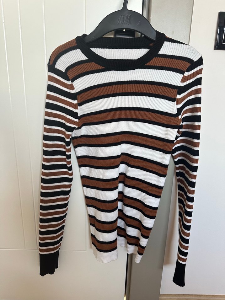 Uzun kollu, bisiklet yaka, ince triko örgüden yapılmış, kahverengi, beyaz ve siyah çizgili kadın kazak. Günlük rahat sokak stili için uygundur.